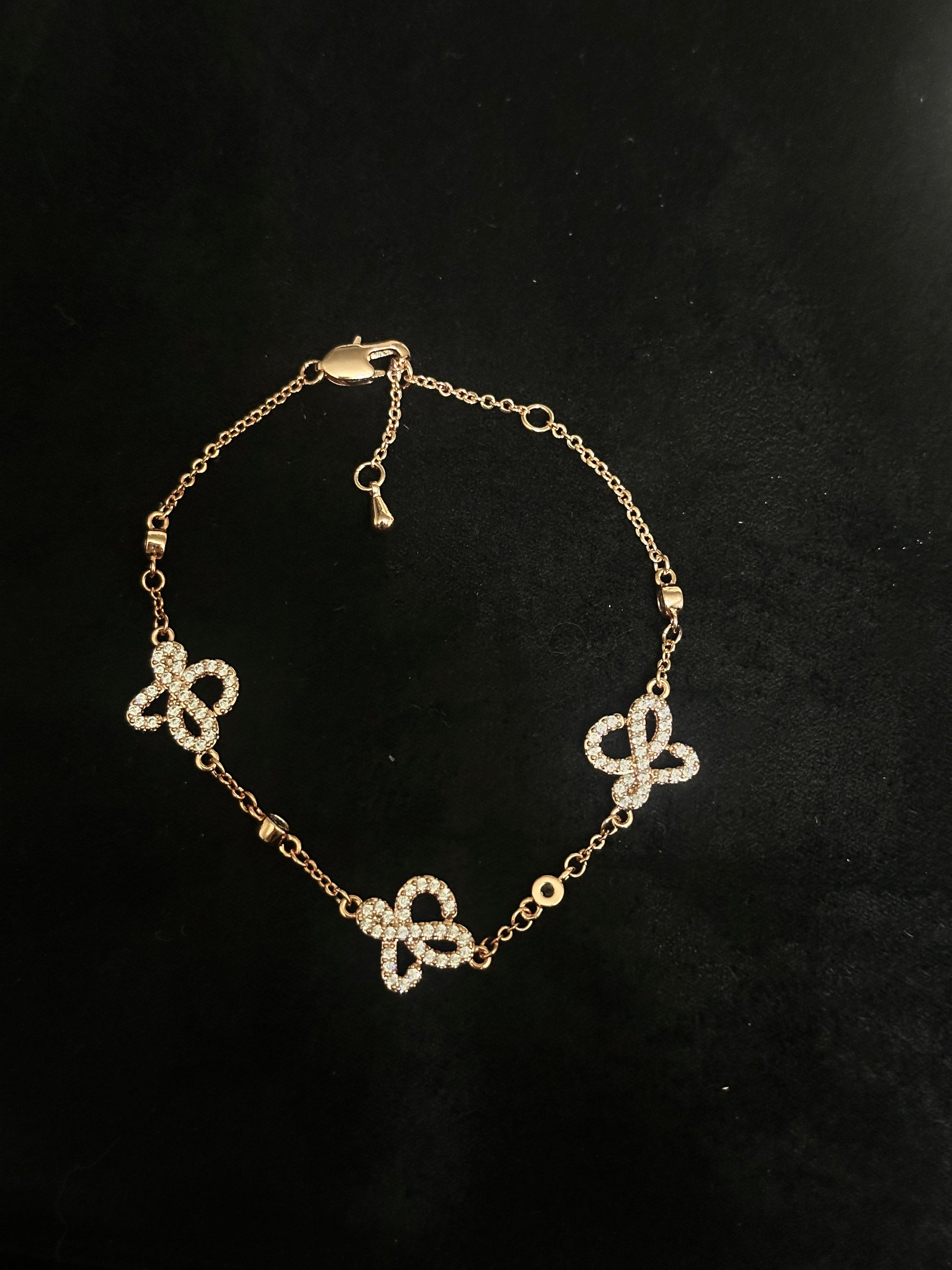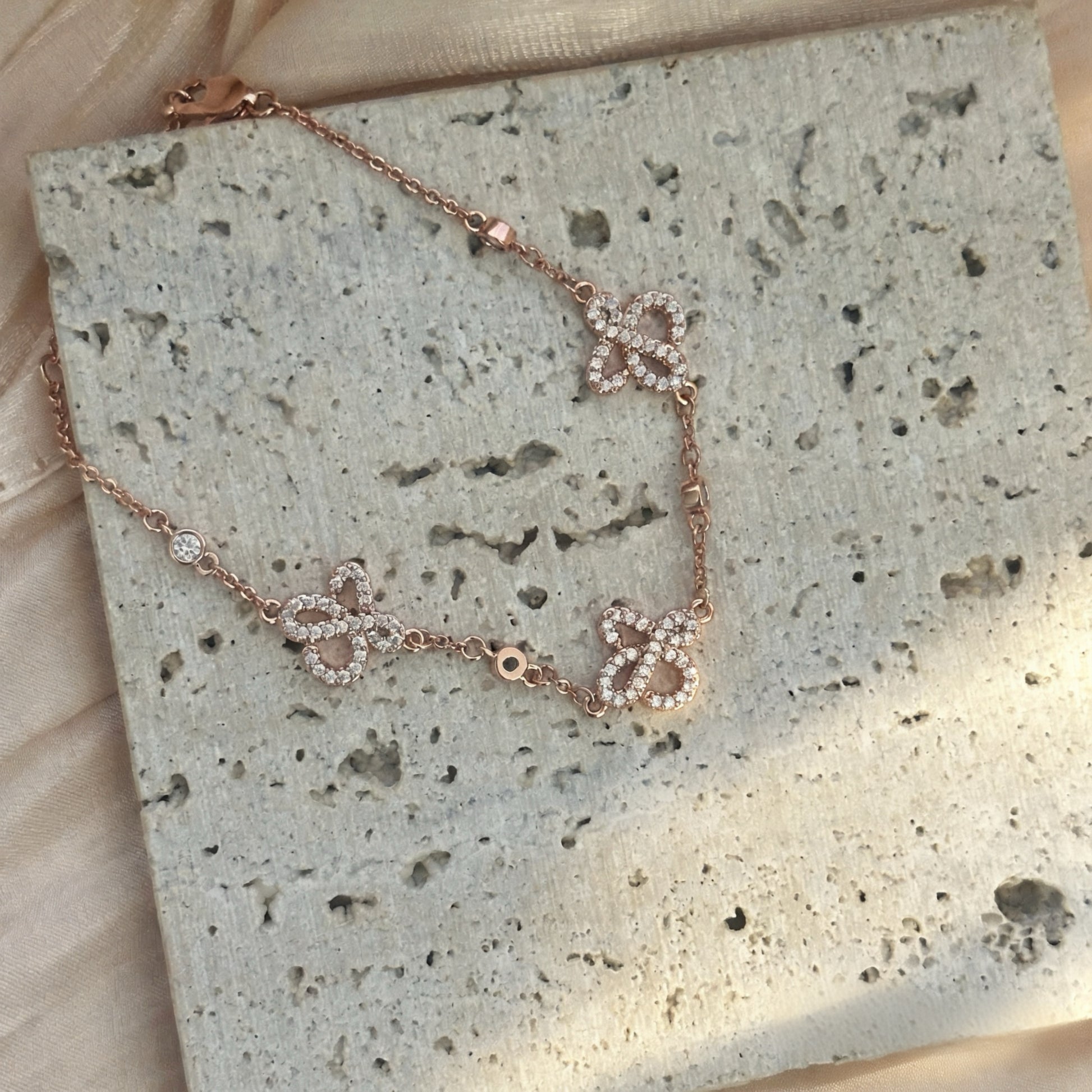 Dieses Schmetterlingsarmband besticht durch drei zarte Schmetterlingsmotive, die mit dezenten Steinen an einer feinen Kette verziert sind. Der Roségoldton verleiht ihm eine warme und edle Ausstrahlung und macht es vielseitig kombinierbar – sowohl solo als auch in Kombination mit anderen Schmuckstücken.