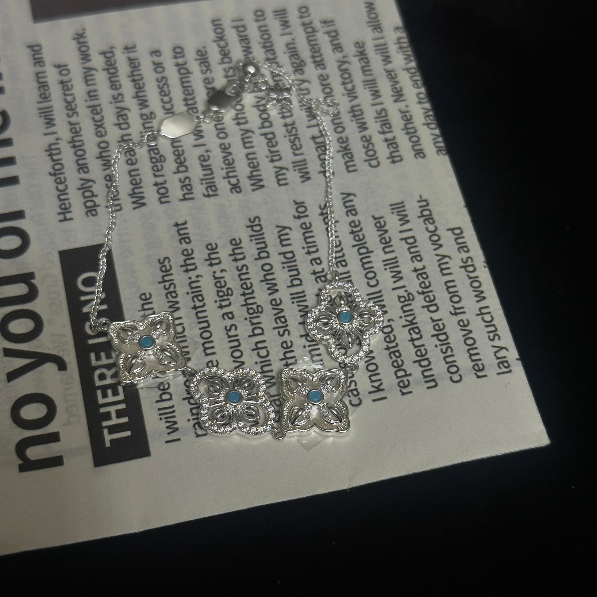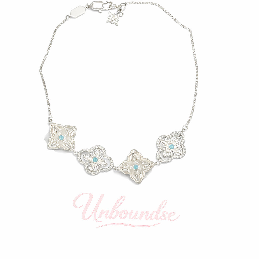 Dieses Armband mit seinen vier kleeblattförmigen Gliedern vereint eine sanfte, antike Textur mit einer klaren, tragbaren Silhouette. Die hellblauen Steine setzen dezente Akzente und machen es zu einem vielseitigen Schmuckstück für jeden Tag oder als Geschenk.