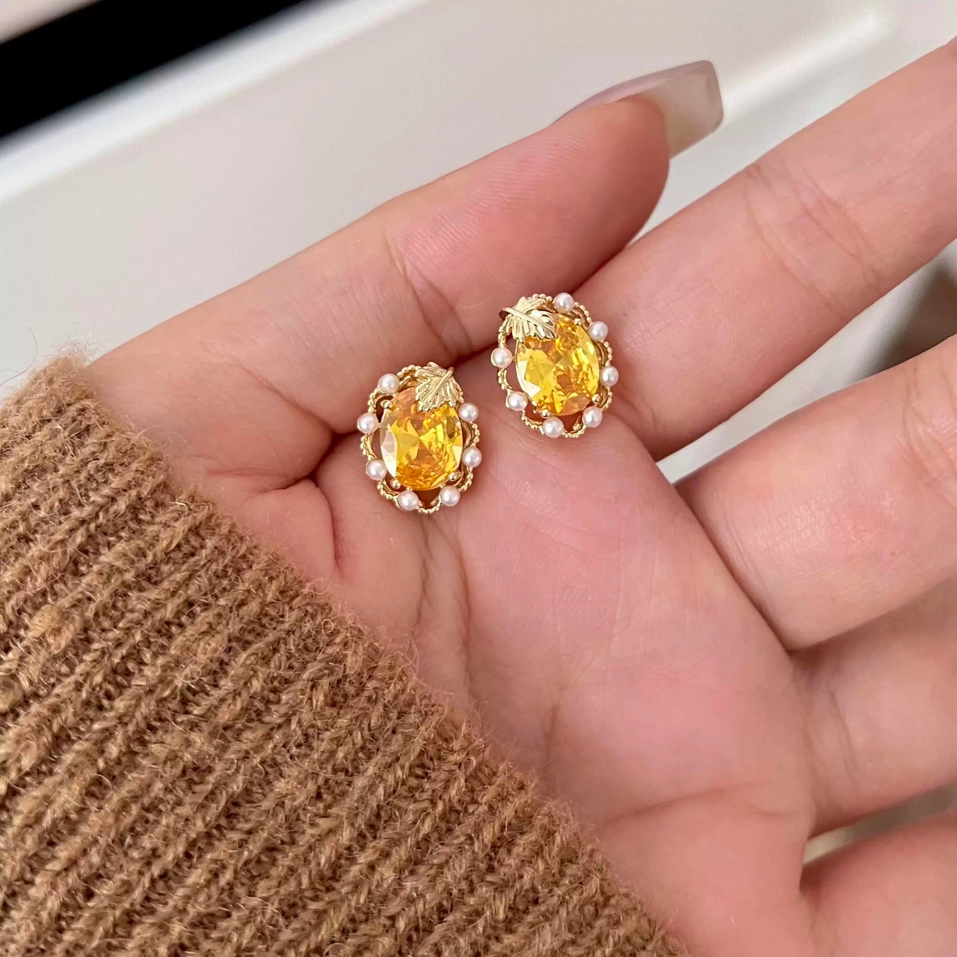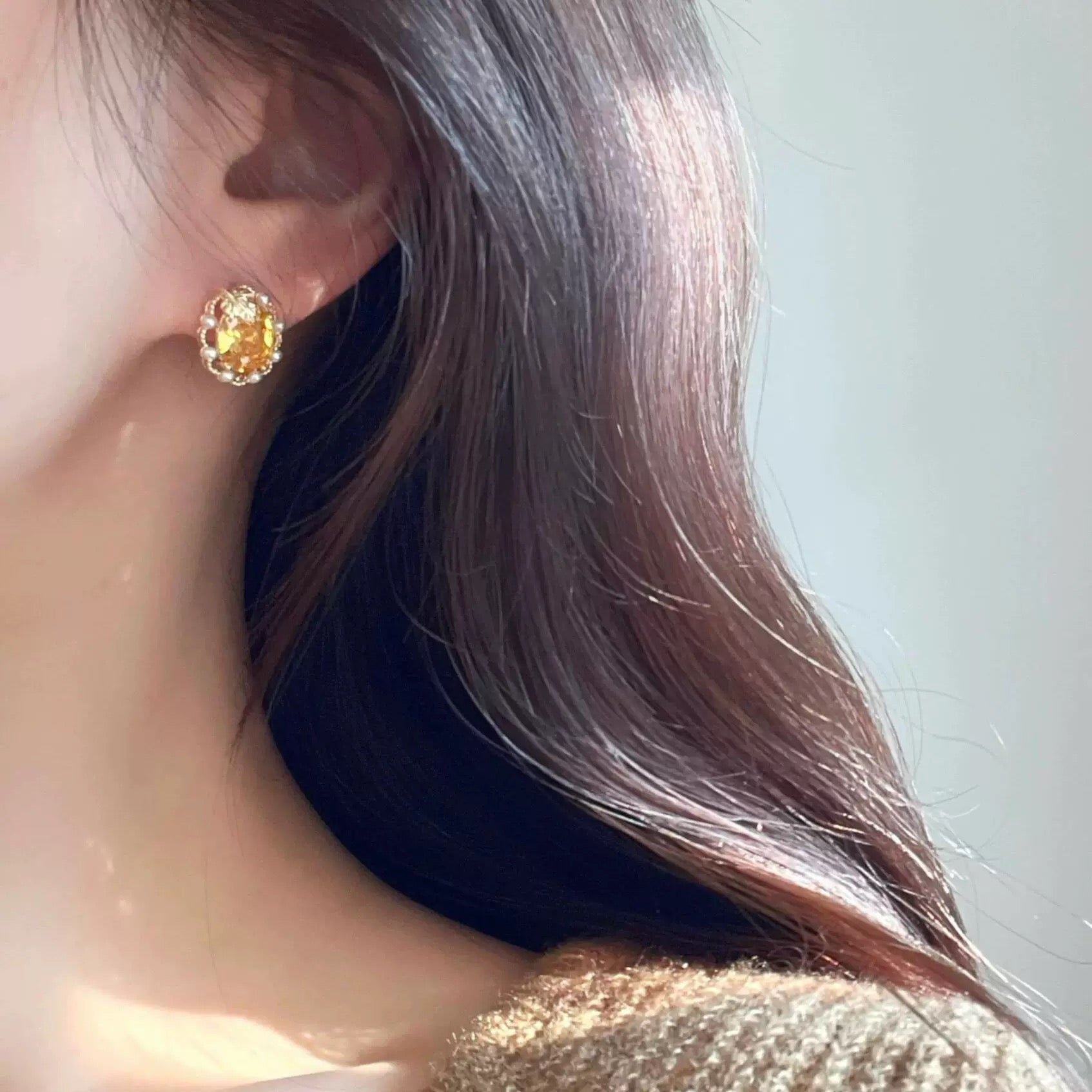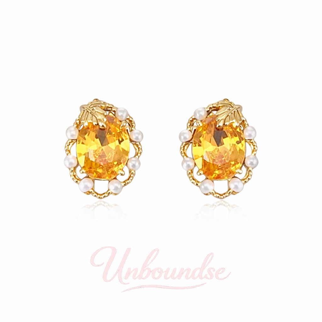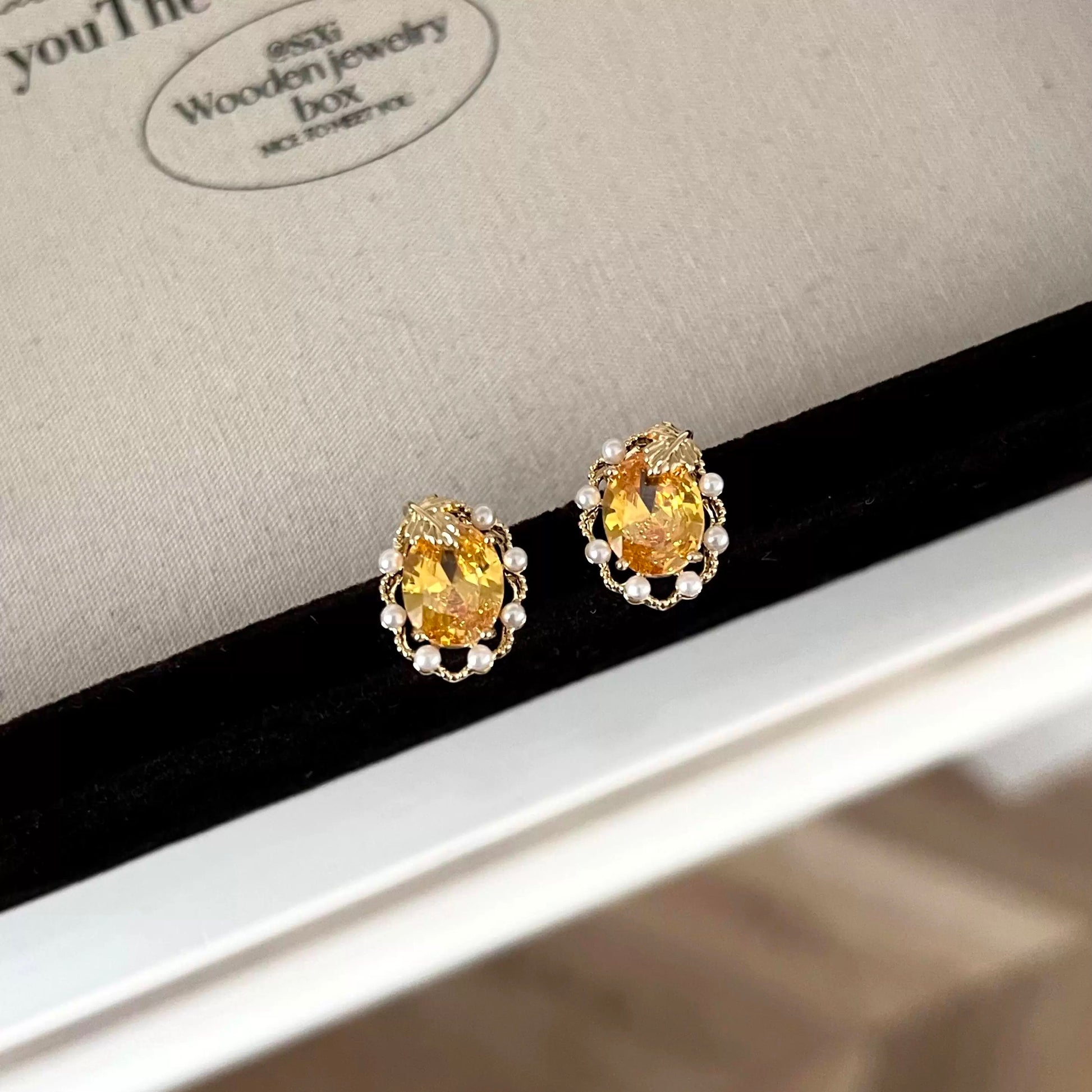 Diese Ohrstecker bestechen durch einen leuchtenden, ovalen gelben Kristall, der von einer zarten, perlenbesetzten Fassung eingefasst ist. Die vom Vintage-Stil inspirierte Silhouette wirkt elegant, feminin und lässt sich sowohl tagsüber als auch abends vielseitig tragen.