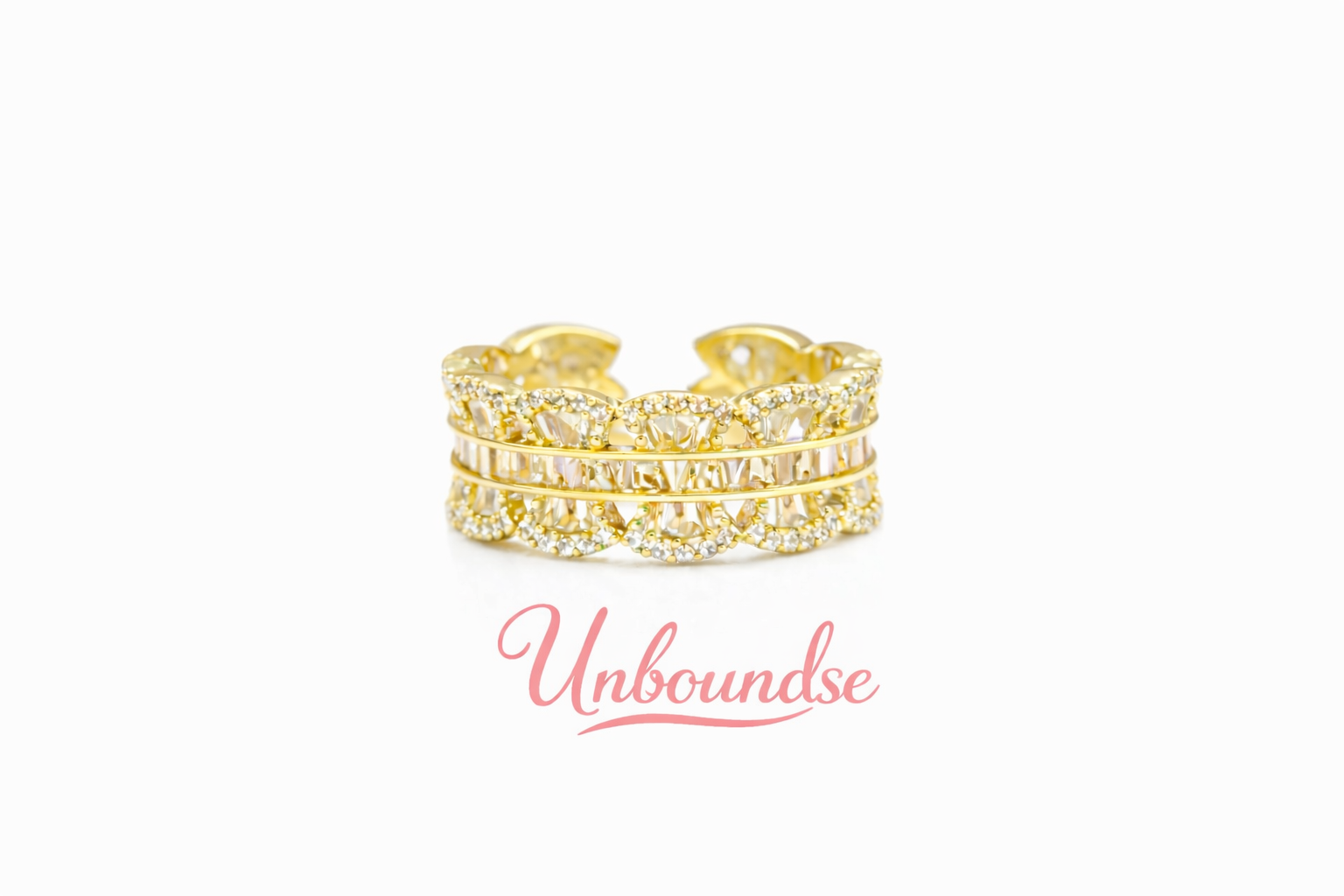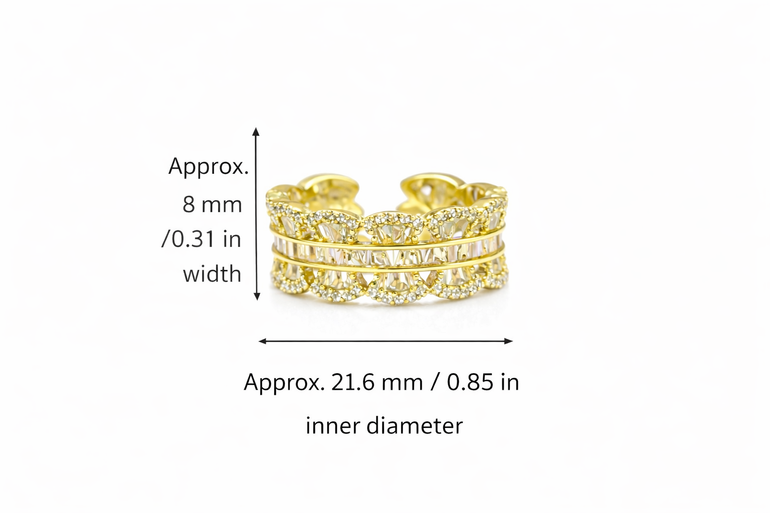 A bold little glow for everyday styling. This gold open ring features a layered mix of baguette-cut and pavé-set stones, designed to catch the light from every angle. Easy to style, eye-catching without feeling too heavy, and perfect for adding a polished finish to your daily stack.Think soft knits, clean nails, a satin slip, or just your everyday basics — this ring does the finishing touch.